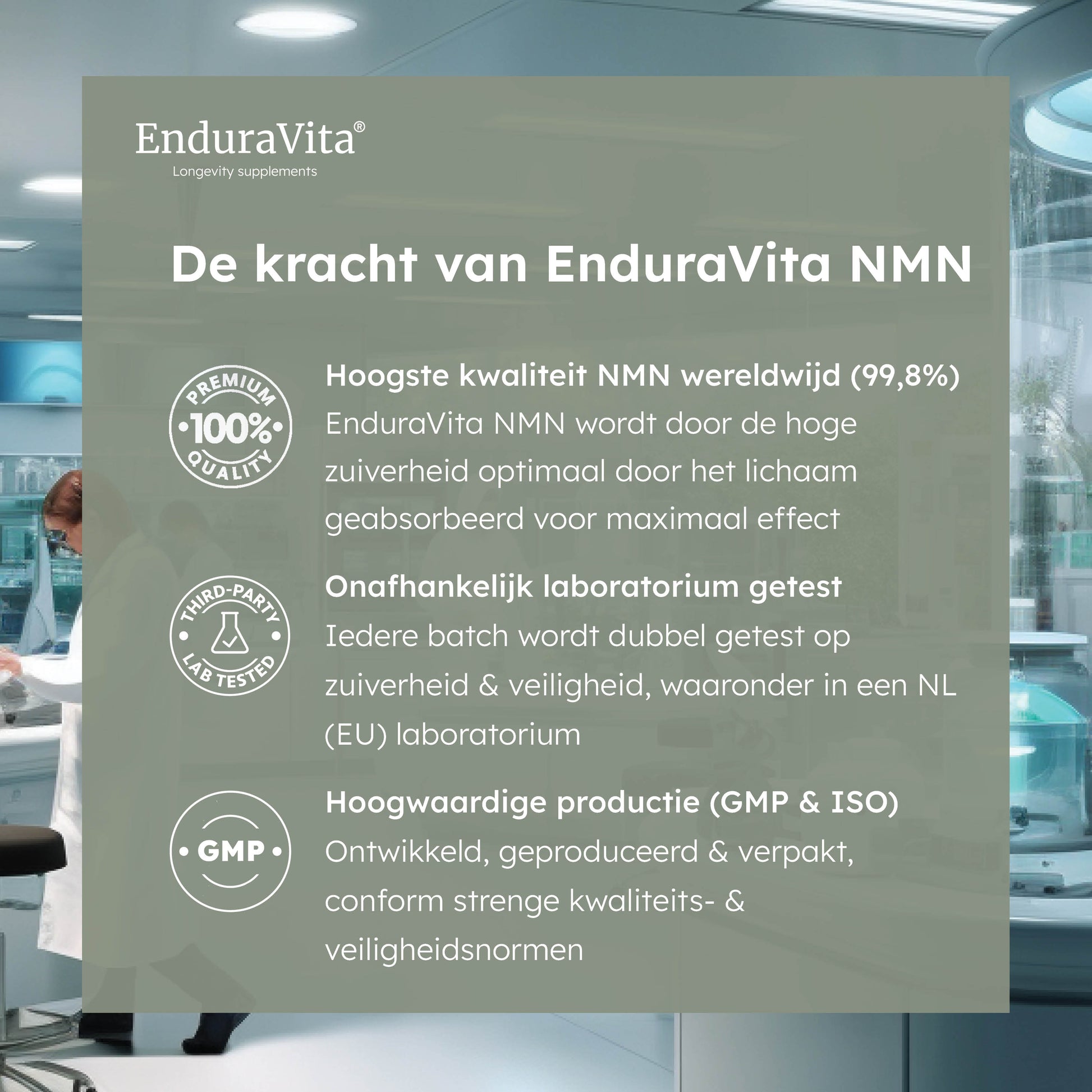 Vores NMN har den højest mulige renhed på ikke mindre end 99,8 %. Det sikrer, at det absorberes perfekt af kroppen. EnduraVitas NMN produceres i henhold til alle vigtige ISO-sikkerhedsstandarder. Derudover er NMN dobbelttestet i laboratorier for kvalitet, konsistens og sikkerhed, herunder et laboratorium i NL (EU).